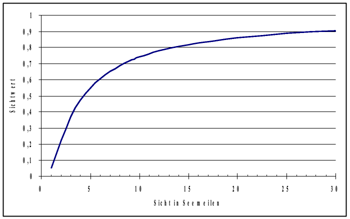 Der Zusammenhang zwischen Sichtwert und der vorherrschenden Sicht in Seemeilen lässt sich bei einem Kontrastschwellenwert des Auges von durch folgende Formel beschreiben: