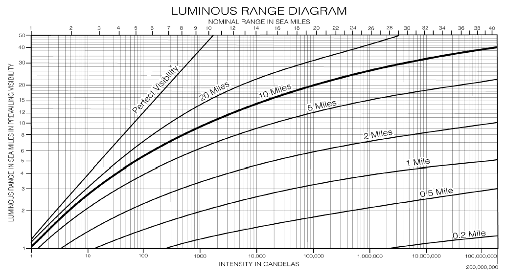 Die Nenntragweiten sind auf der oberen X-Achse aufgetragen. Die Kurvenschar stellt die verschiedenen Sichtweiten in Seemeilen dar; die tatsächlich vorherrschende Tragweite wird an der linken Y-Achse abgelesen.