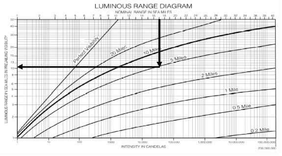 Die Nenntragweiten sind auf der oberen X-Achse aufgetragen. Die Kurvenschar stellt die verschiedenen Sichtweiten in Seemeilen dar; die tatsächlich vorherrschende Tragweite wird an der linken Y-Achse abgelesen.