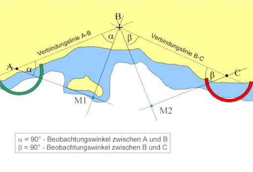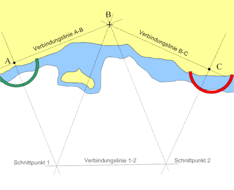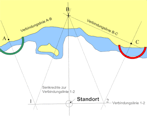 Das Verfahren sieht vor, den Winkel zwischen je zwei von insgesamt drei Objekten A, B und C zu messen und daraus den Standort bestimmen zu können.